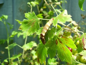 I went to check on my black currant bush to see if some of the currants were ready to be picked when–surprise! I noticed this weird camouflaged caterpillar. Lucky I saw it before I touched it. (Shudder)