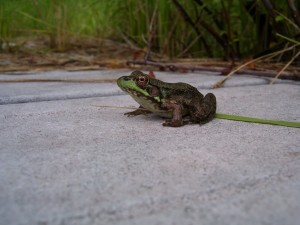 I think this is a green frog (Rana clamitans). I was pretty excited when it stood still and let me snap quite a few pictures. How cool, how friendly, I though.