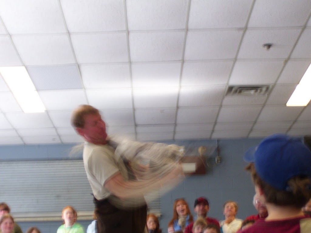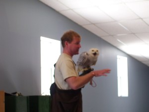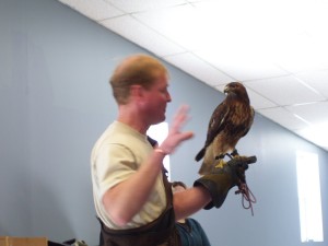 And the red-trailed hawk (below) performed one dramatic flight demonstration. Besides pretty much skimming my head it flew into a ceiling tile and found the kitchen in this auditorium. Quite a crowd rousing performance! The bird was fine.