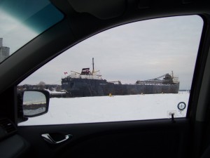 Too bad I didn’t have the courage to photograph the guy just to the left of my vehicle here, the guy who attempted to drive up the driveway to the ship and got stuck. (Yeah, what driveway? There was a path through the snow, not visible to the human eye in this photo, up to the ship. Apparently someone had used it, but I wasn’t gonna try.). So anyway, this man got stuck at the very start of this supposed path and was gunning his engine and spinning his wheels as I took this shot. Ahh, the sound of Canada in the winter.