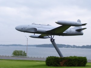 Check out this bomber out front of the place we stayed at! That’s the St. Lawrence River in the background. For scale, a nine-year-old is about as tall as those bushes.